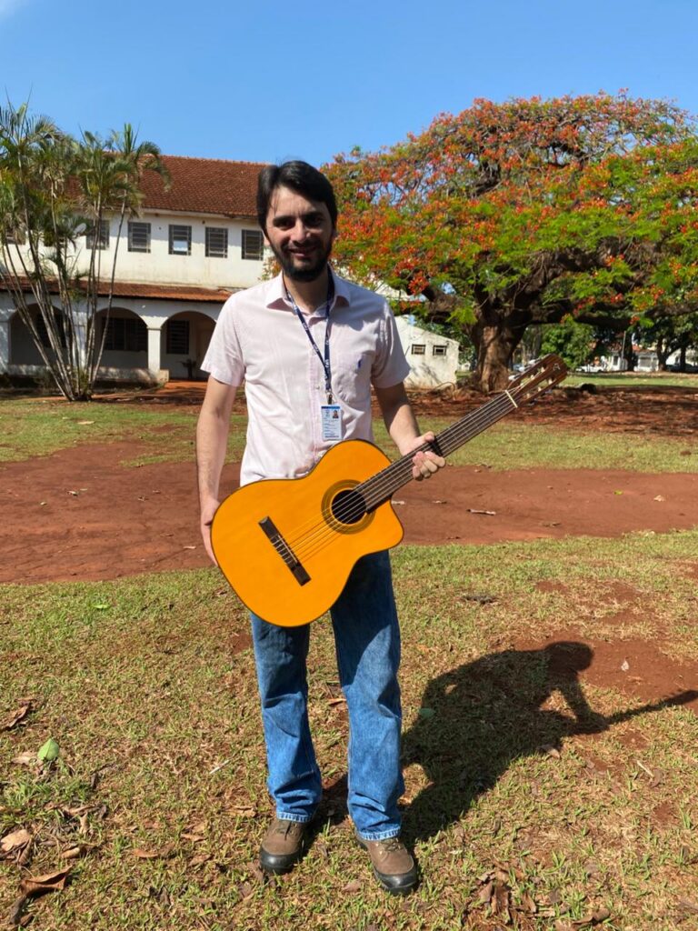 Durante o expediente, o Roberto é um servidor comprometido, sempre pronto para ajudar. Fora da universidade, a dedicação continua e se transforma em música. Com o violão nas mãos e a voz afinada, ele emociona todas as pessoas que têm o privilégio de ouvi-lo. “Meus avós por parte de pai tocavam viola e por parte de mãe tocavam sanfona, então eu digo que não escolhi a música, foi ela quem me escolheu. Sou egresso da UFG/UFJ e, na época, com o curso em período integral, trabalhar durante a noite, com música, me proporcionou uma fonte de renda alternativa. Sou grato porque sirvo o público durante a semana e aos fins de semana estou divertindo e brincando com esse mesmo público”, conta Roberto Barros.