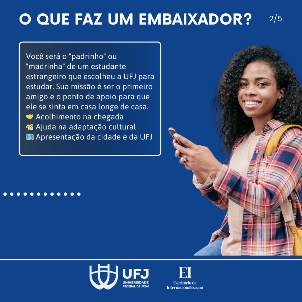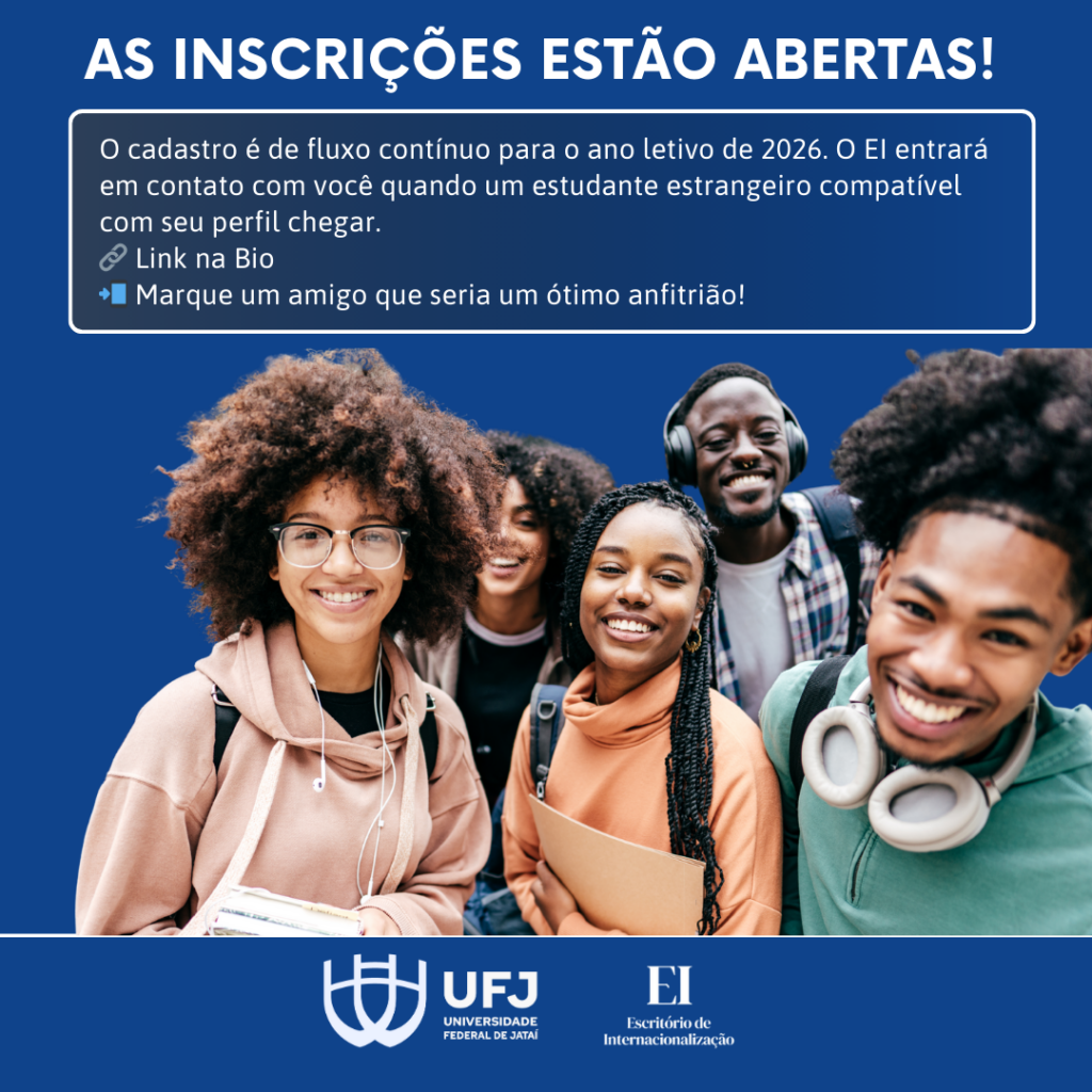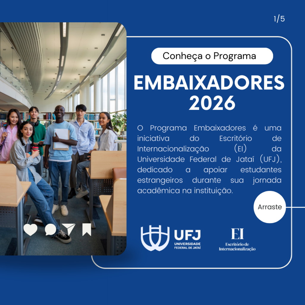 O Escritório de Internacionalização (EI) da Universidade Federal de Jataí (UFJ) publicou o edital do processo de seleção de discentes, docentes e servidores técnicos-administrativos da UFJ interessados em participar do Programa Embaixadores, visando ao acolhimento e integração de estudantes estrangeiros durante o ano letivo de 2026.