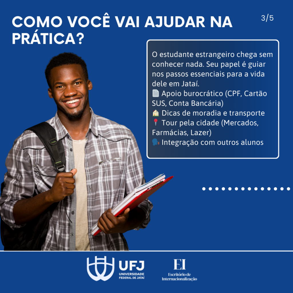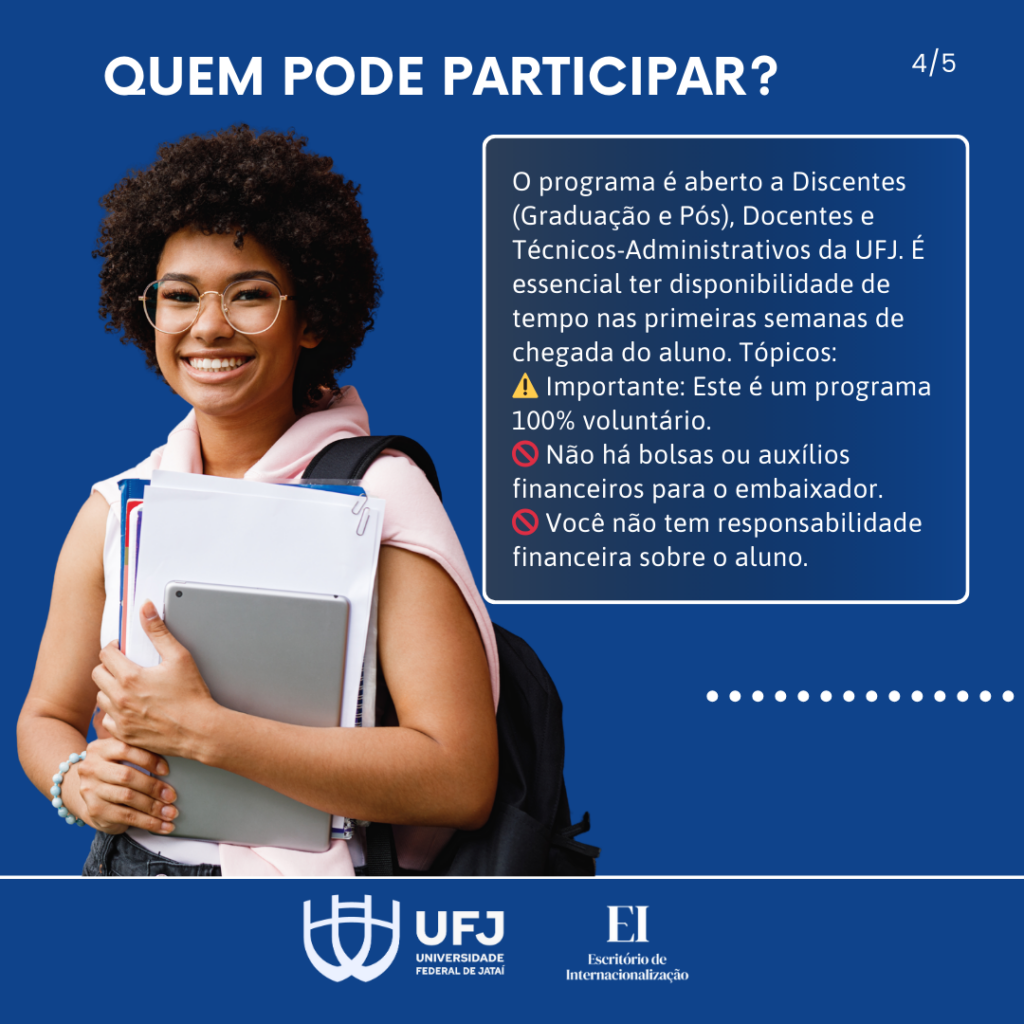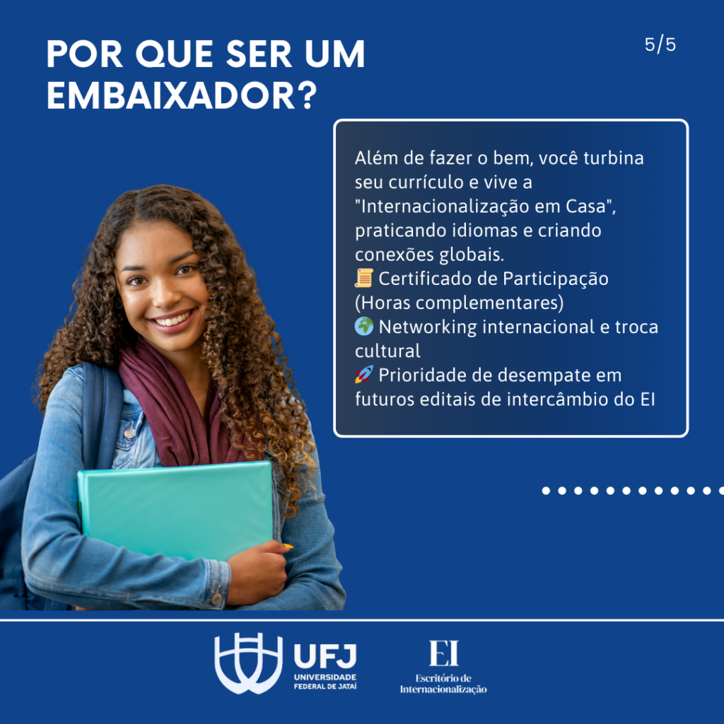 O Escritório de Internacionalização (EI) da Universidade Federal de Jataí (UFJ) publicou o edital do processo de seleção de discentes, docentes e servidores técnicos-administrativos da UFJ interessados em participar do Programa Embaixadores, visando ao acolhimento e integração de estudantes estrangeiros durante o ano letivo de 2026.