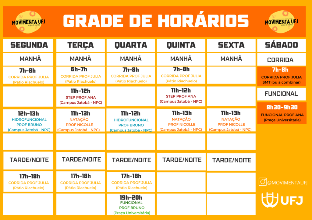 - As atividades acontecem em diferentes espaços da UFJ, por isso é importante observar atentamente os locais indicados na grade de horários.