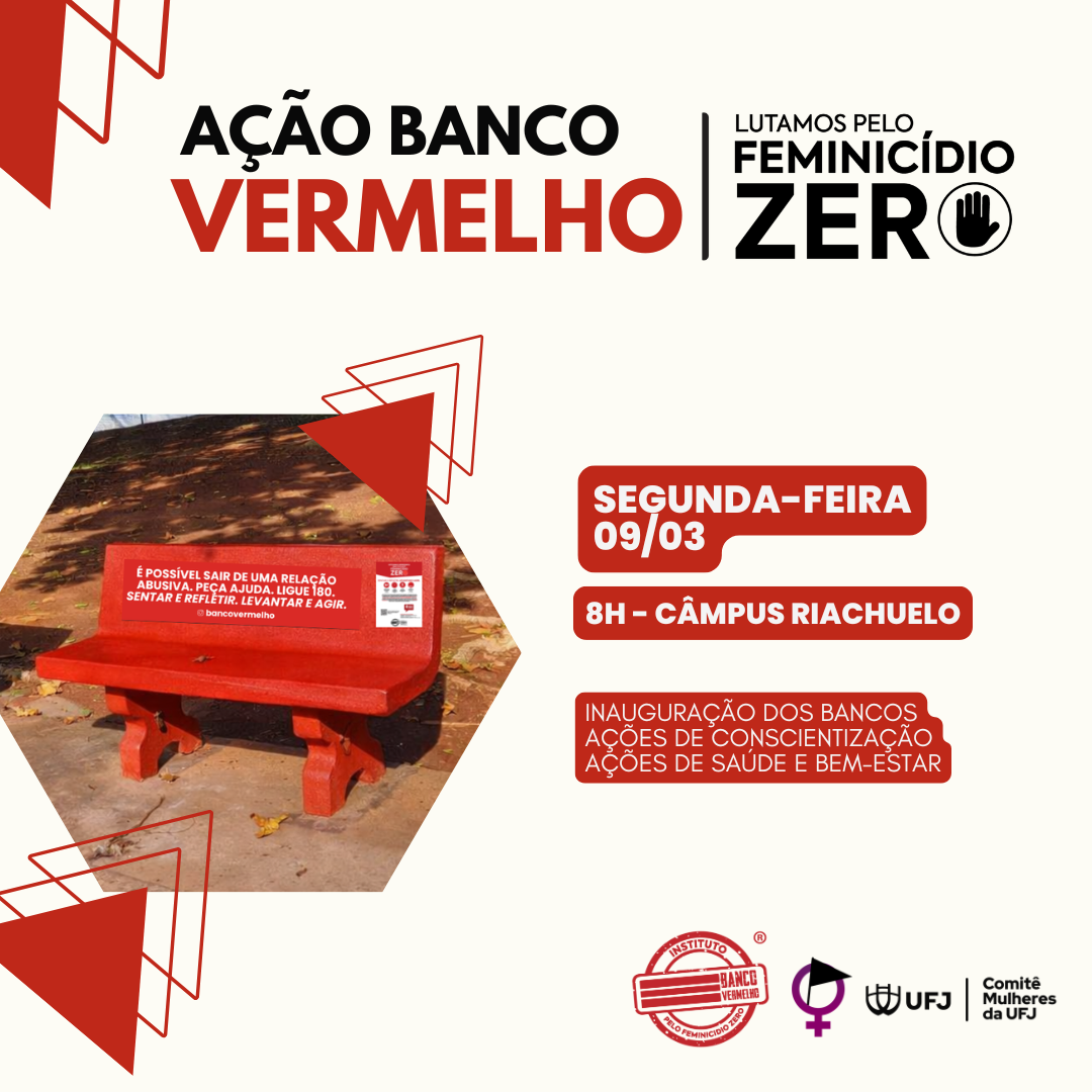 🪑🔴 No dia 09 de março de 2026, a partir das 8h, no Câmpus Riachuelo da UFJ, realizaremos a inauguração dos bancos vermelhos com um momento especial de reflexão, conscientização e bem-estar em prol da vida das mulheres.