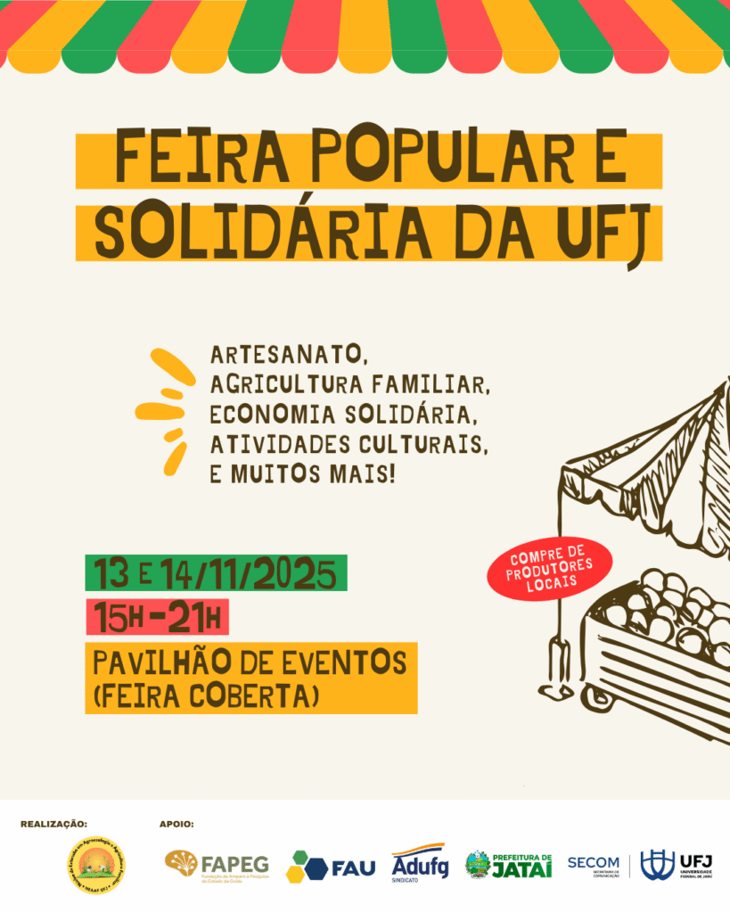O Núcleo de Estudos, Pesquisa e Extensão em Agroecologia e Agricultura Familiar (NEAAF/UFJ) convida toda a comunidade acadêmica e externa para a terceira edição da Feira Popular e Solidária da UFJ.