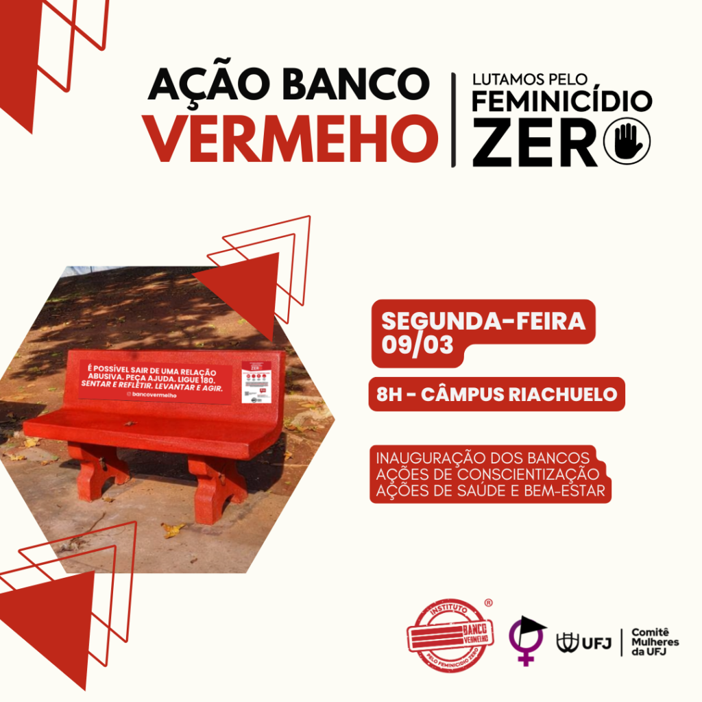 🪑🔴 No dia 09 de março de 2026, a partir das 8h, no Câmpus Riachuelo da UFJ, realizaremos a inauguração dos bancos vermelhos com um momento especial de reflexão, conscientização e bem-estar em prol da vida das mulheres.